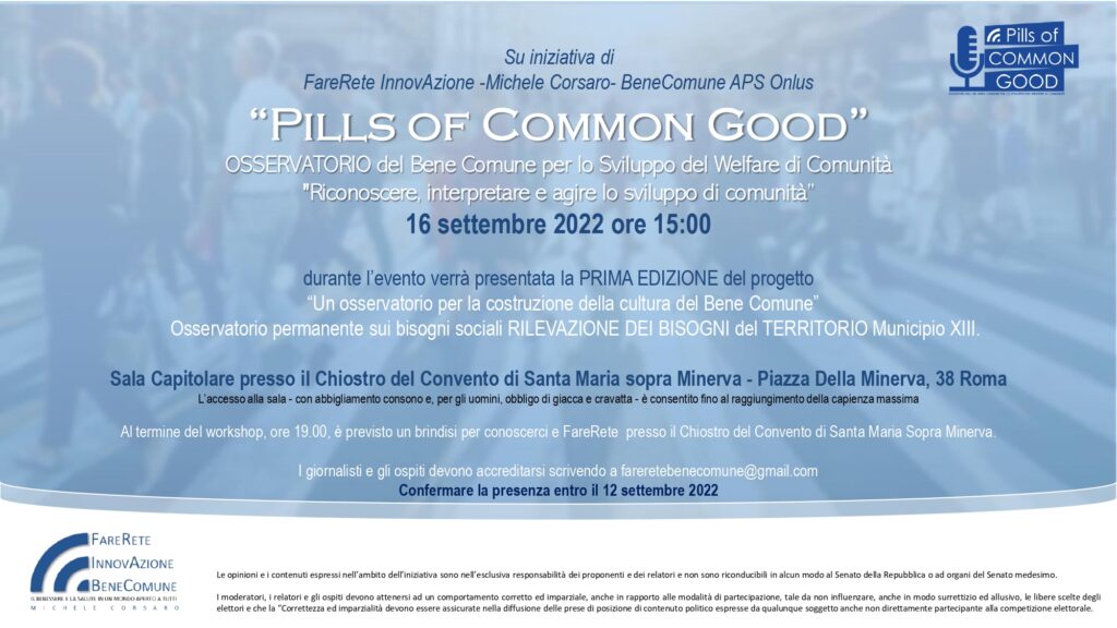 Pillole di bene Comune è il nuovo progetto multimediale legato al mondo della cultura del Bene Comune, di FareRete Innovazione BeneComune APS. Tale iniziativa, conferma la vocazione ai temi riguardanti il Bene Comune inteso come Bene Immateriale, il diritto alla vita, la famiglia, il diritto alla salute, al lavoro e la libertà religiosa, la cultura della cittadinanza e il ruolo attivo dei cittadini all’interno della comunità di appartenenza. Fare Rete Innovazione BeneComune APS già da 7 anni promuove questi concetti con attività volte agli associati, ma soprattutto alle Istituzioni e ai cittadini. Favorisce quelle iniziative che contribuiscono a diffondere e sviluppare la “cultura” del Bene Comune e dove possibile dà risposte concrete a specifici bisogni.I nostri referenti primari sono le Istituzioni, gli Operatori Qualificati e tutti gli interlocutori interessati alle aree su cui concentriamo i nostri sforzi. La proposta “Pills of Common Good ” consiste in brevi video, video-pillole di Innovazione al BeneComune appunto, che, a portata di click, raccontano aneddoti e curiosità sull’innovazione nei nostri giorni, di un Bene aperto a tutti.